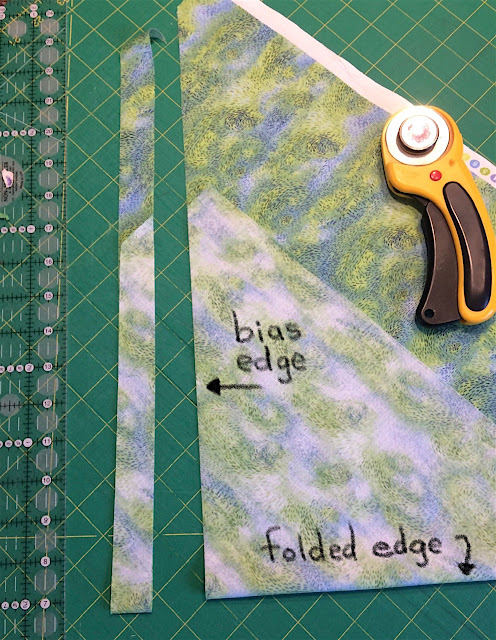 Next, line up the 1" mark on your ruler with the bias edge you just made on your fabric. Cut a 1" bias strip. continue cutting strips as needed.